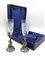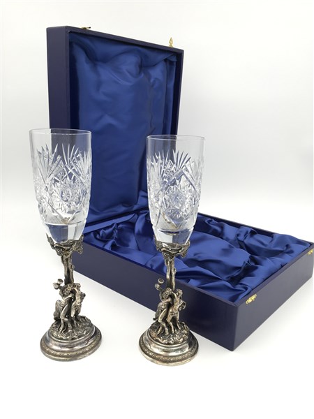 Coppia di calici in cristallo molato con base in argento cesellato a figure di baccanti a tutto tondo (h cm 24)(gr 870 lordi) Contenuti in custodia originale (difetti)