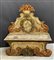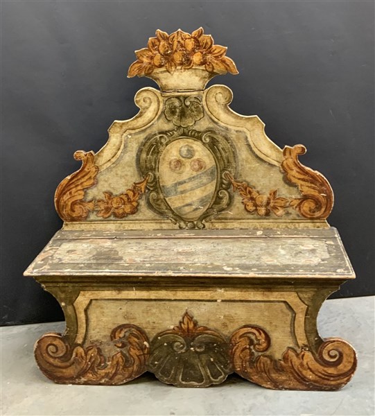 Panchetta in legno con seduta alzabile, schienale sagomato decorata con festioni ed uno stemma araldico. (cm 103x115x34) (difetti e mancanze)