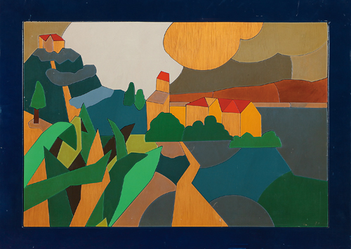 UGO NESPOLO Mosso Santa Maria (Bi) 29/08/1941 Disincantato, 1978 acrilici e intarsio su tavola cm. 50x70, etichetta dell'artista con titolo, anno e firma al retro, dichiarazione d'autenticità dell'artista su foto, certificato della Telemarket allegato, opera priva di cornice.