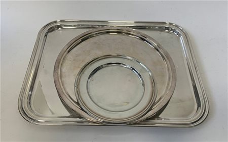Lotto composto da due piatti di forma circolare in argento liscio uniti ad un vassoio rettangolare con tesa scanalata. Titolo 800, manifatture diverse (g 1680)