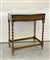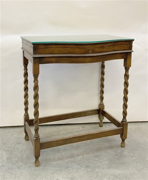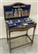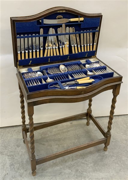 Manifattura inglese, servizio di posate in metallo argentato composto da dodici forchette con cucchiai e coltelli, dodici forchettine da frutta con coltelli, quattro cucchiai da portata, ventidue cucchiaini e tre posate a servire e un affilacoltelli. contenuto in tavolo con piano apribile. (difetti)