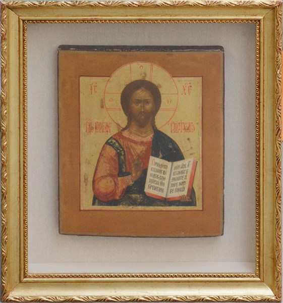 Arte russa, secolo XIX "Cristo pantocratore" icona ad olio su tavola (cm 31x26) Entro teca in legno dorato (difetti)