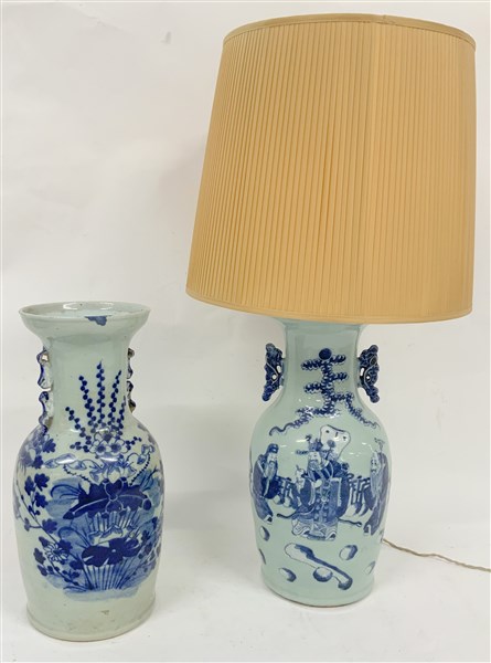 Due vasi in porcellana a fondo celadon, uno montato a lampada. Cina, fine dinastia Qing (1644-1912) (