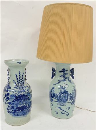 Due vasi in porcellana a fondo celadon, uno montato a lampada. Cina, fine dinas