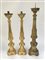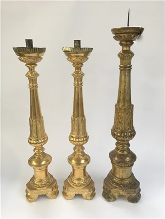 Lotto composto da una coppia di candelieri in legno dorato e intagliato a fusto tornito (h. cm 78) uniti ad un altro di simil decoro. Secolo XIX (h. cm 86) (difetti)