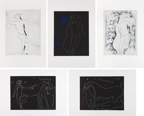 MARINO MARINI Pistoia 27/02/1901 - Viareggio (Lu) 06/08/1980 La sorpresa; La sorpresa (II), 1973; Gioco I, 1973; Presentazione II, 1973; Il profondo II, 1973 5 opere (acquaforte; acquaforte e acquatinta a colori; acquaforte e puntasecca) su carta cm. 99x70, esemplari P.A.; firme in basso a destra, le carte si presentano leggermente ingiallite e con piccole fioriture, pubblicate su "Marino Marini" catalogo ragionato dell'opera grafica (incisioni e litografie) 1919-1980 a cura di Giorgio e Guido Guastallo, edizioni Graphis Arte, pagina 218 al repertorio A161 - A163 - A166 - A169 - A170 - Opere prive di cornice.