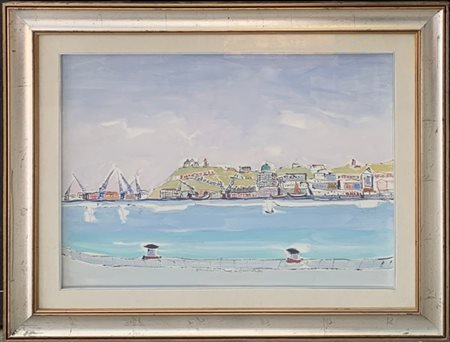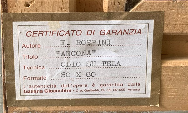 Francesco Rossini "Ancona" olio su tela (cm 60x80) firmato e titolato in basso al centro, firmato e titolato al retro. In cornice