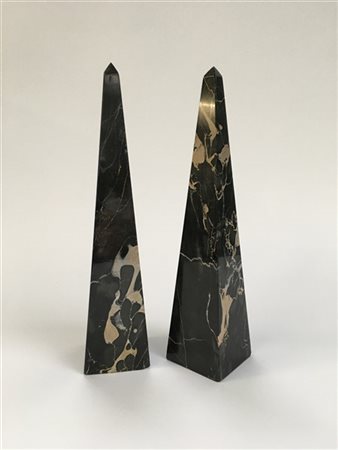 Coppia di obelischi in marmo portoro. (h cm 33) (difetti e mancanze)
