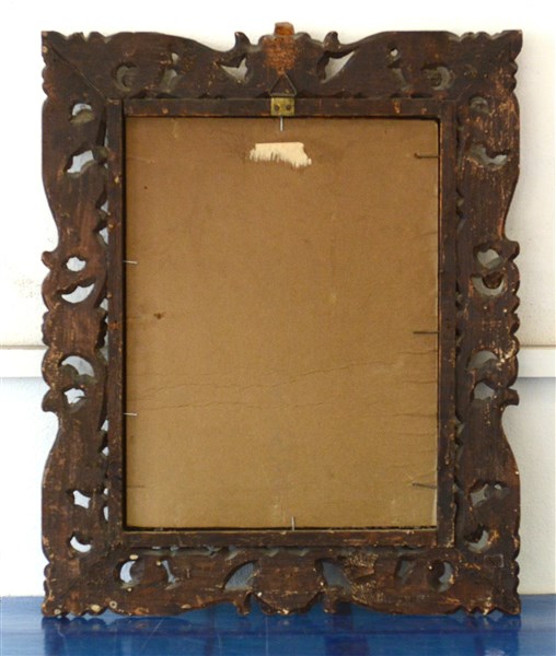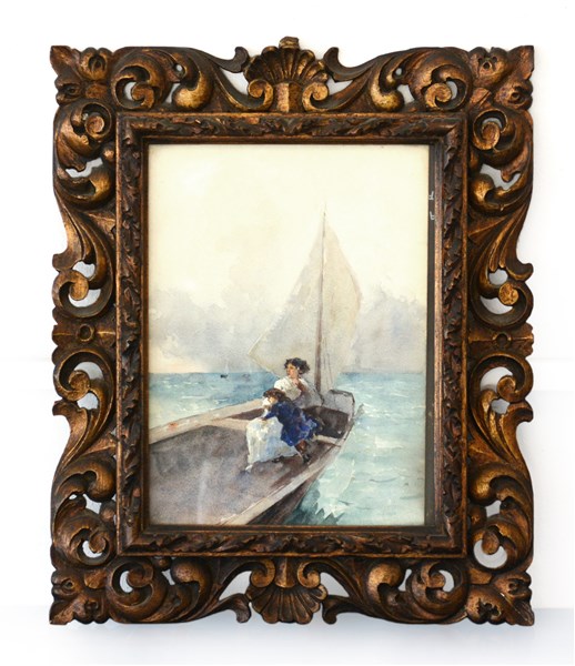 Ignoto "Figure in barca" acquarello su cartoncino applicato su cartone pressato (cm 35x24,5) in cornice di legno intagliato e traforato