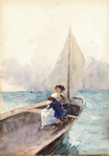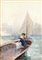 Ignoto "Figure in barca" acquarello su cartoncino applicato su cartone pressato