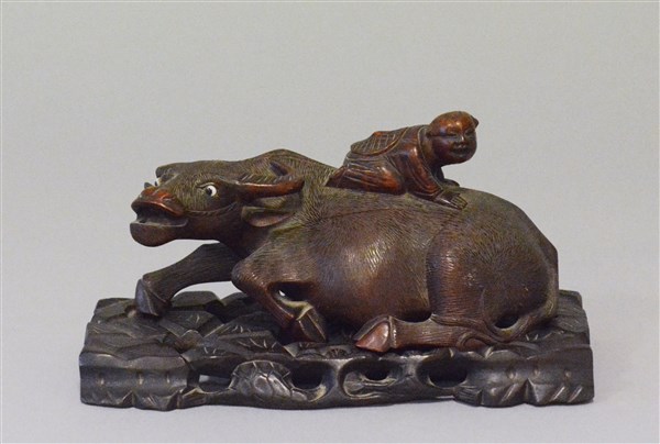 Scultura in legno raffigurante bufalo, base in legno (difetti e rotture) Cina,