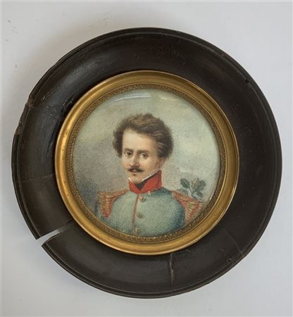 Ignoto del secolo XIX "Ritratto di Ufficiale austriaco o di uno dei piccoli Regni tedeschi" miniatura su avorio (d. cm 6) In cornice (difetti)