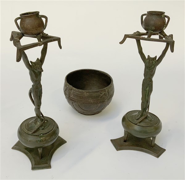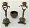 Lotto composto da una coppia di candelieri con fusti retti da figure fantastiche ed un vasetto in bronzo (difetti)