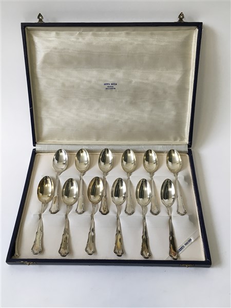 Servizio da dodici cucchiaini in argento in custodia (gr 270 ca) (lievi difetti