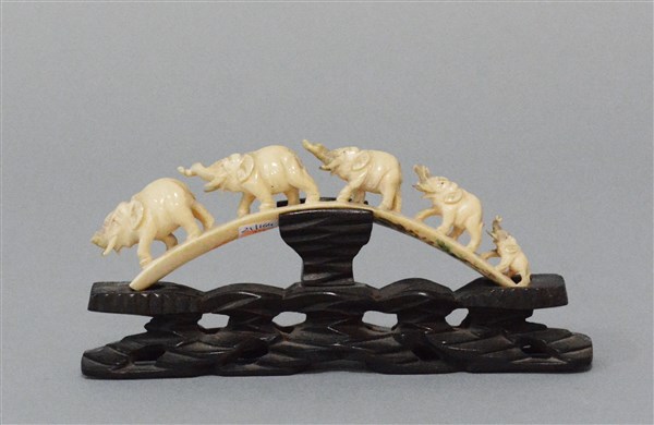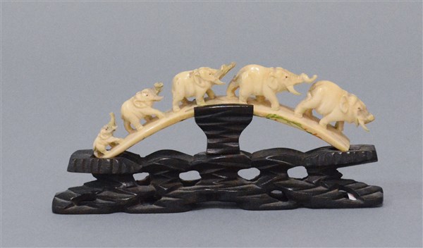 Gruppo in avorio raffigurante elefanti, base in legno (difetti e mancanze)
