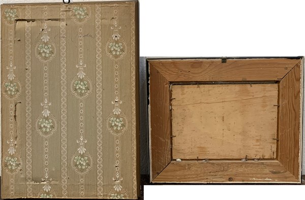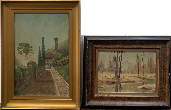 Lotto di due dipinti a olio su compensato raffiguranti "Paesaggi" (cm 34x23 e cm 24x17) uno dei due reca firma indecifrata in basso a sinistra. In cornici