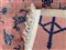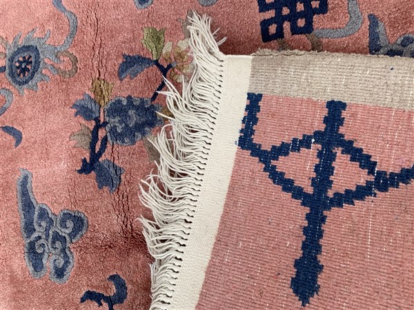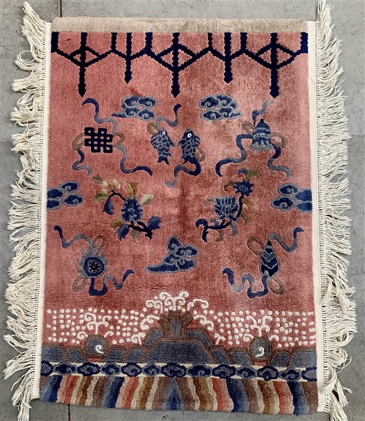 Tappeto meditativo, Tibet, secolo XX. Decoro asimmetrico con simbolo taoisti e buddhisti su fondo rosa (cm 93x62) (difetti)