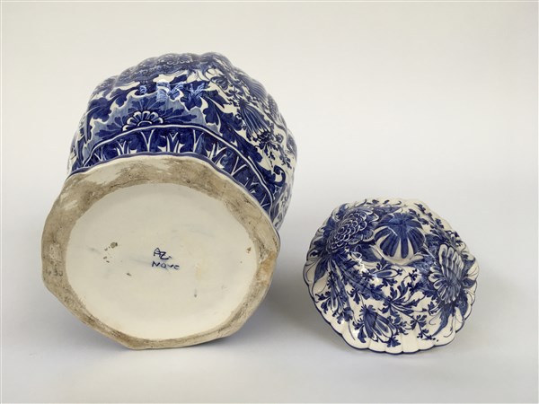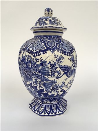 Manifattura Nove di Bassano. Vaso in ceramica decorato nei toni del blu all'orientale con coperchio e decoro orientale (h cm 39) (difetti)