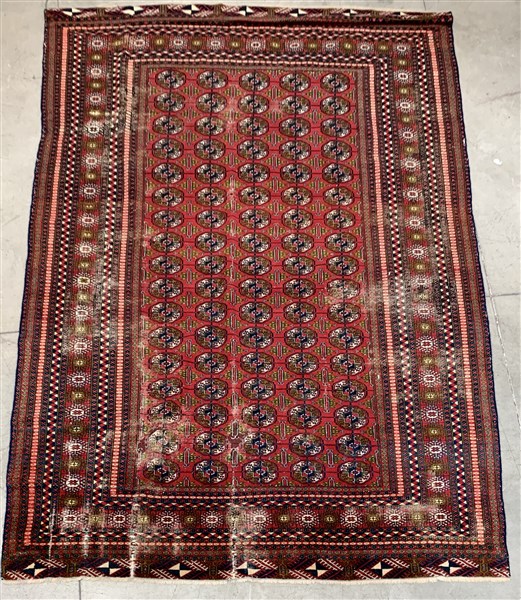 Tappeto Boukhara, Pakistan, Secolo XX. Decoro con Gül su fondo rosso (Difetti, rapature e vecchi restauri) (cm 261x182)