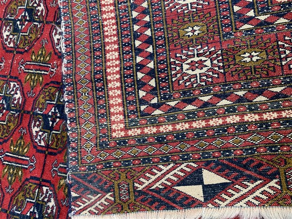 Tappeto Boukhara, Pakistan, Secolo XX. Decoro con Gül su fondo rosso (Difetti,