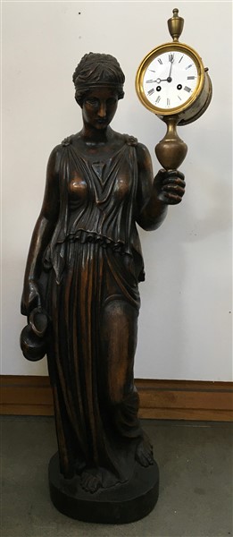 Orologio sorretto da scultura femminile in legno.