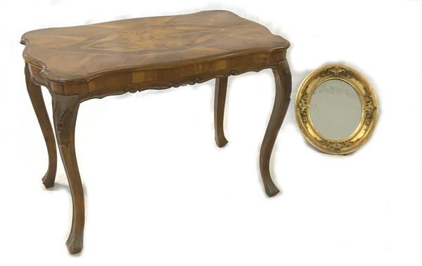 Lotto composto da un tavolo basso con piano di forma mossa lastronato e filettato ed una piccola specchiera di forma ovale in legno dorato (difetti e mancanze)