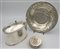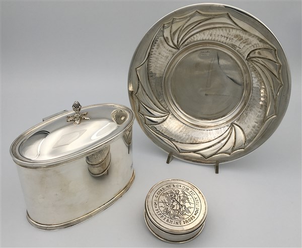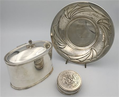 Lotto composto da una scatola porta the ovale, una scatolina tonda ed un alzatina, in argento di diverso decoro (gr 1050)