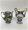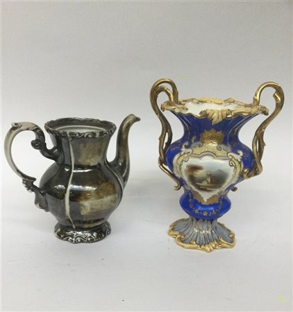Lotto composto da un vaso biansato in porcellana a fondo blu centrato da cartella con paesaggio decorato a dorature (h cm 22) ed un versatoio in ceramica (h cm 16) (Dmr)