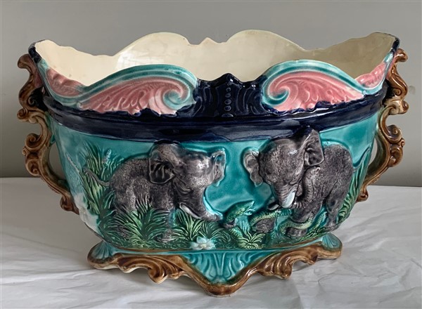 Vaso in ceramica policroma con raffigurazioni a bassorilievo raffiguranti due elefanti su fondo azzurro. Numerato 4141 sotto la base. (cm 36x22x26) (difetti)