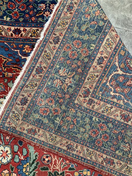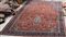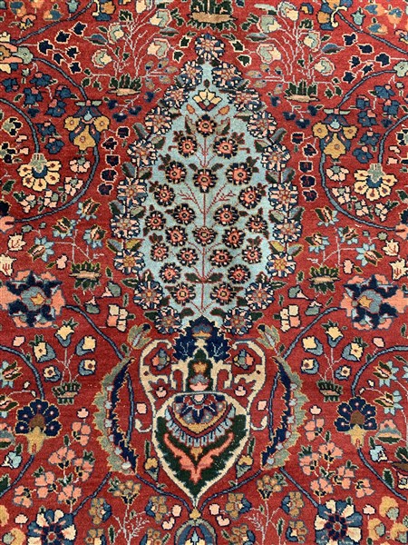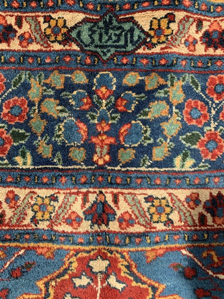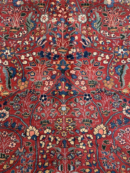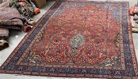 Tappeto preghiera Sarouk, Persia, secolo XX. Mirab decorato con vaso fiorito e numerose volute con fiori su fondo rosso. Alla testata superiore è presente un cartiglio con iscrizione in caratteri persiani (cm 381x278) (Difetti, rapature)