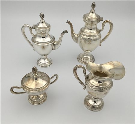 Parte di servizio in argento composto da due caffettiere, una zuccheriera biansata con coperchio e una lattiera con profili cesellati a palmette (gr 620)