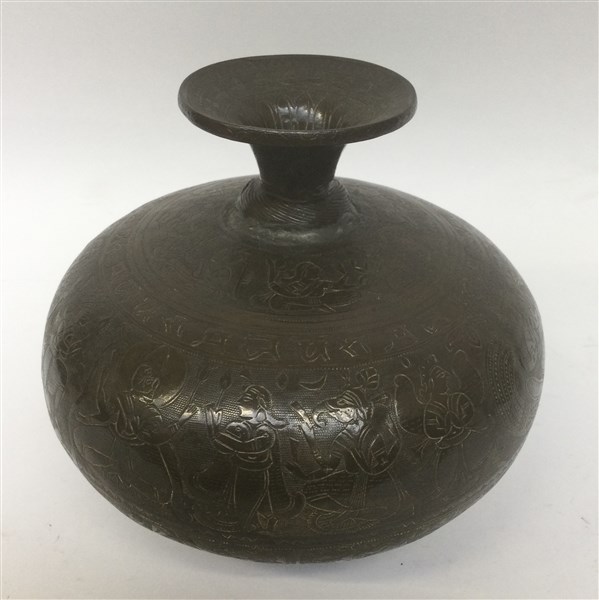 Manifattura orientale, vaso in rame inciso a figure (h cm 20) (difetti)