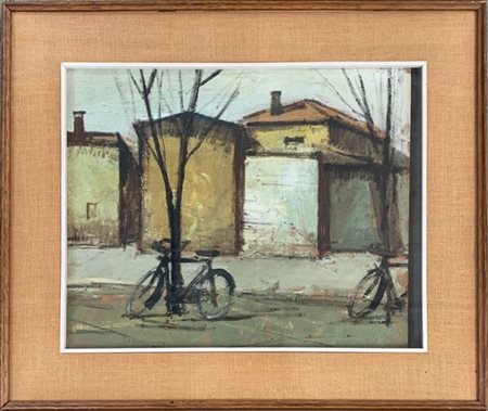 Lamberto Lamberti "Biciclette" 1969, olio su masonite (cm 40x50) firmato, titola
