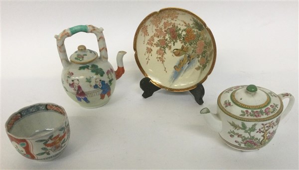 Manifatture diverse, lotto composto da due teiere, una ciotola e un piattino satsuma (difetti e restauri)