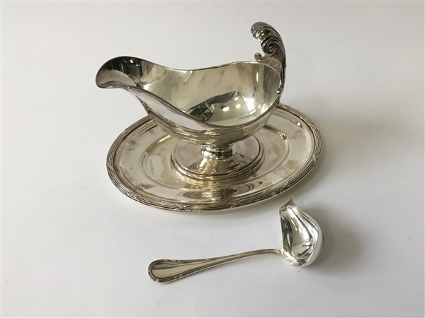 Salsiera in argento con presa a ricciolo e cucchiaio, argentiere Cesa, titolo 9