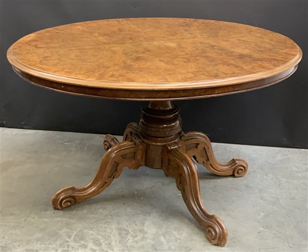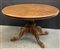 Tavolo di forma ovale lastronato con gamba centrale a colonna tornita terminante a quattro piedi sagomati, secolo XIX (cm 140x70x107) (difetti)