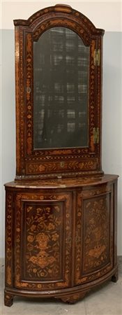 Angoliera lastronata e intarsiata a motivi vegetali, parte superiore a un'anta a specchio, parte inferiore a due ante centrate da vaso fiorito. Olanda, secolo XIX (difetti)
