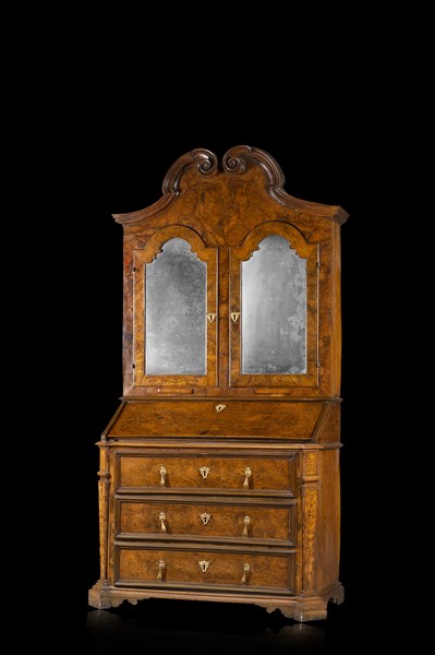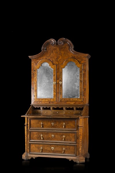 Trumeau lastronato in radica di noce e filettato in legno chiaro. Parte superiore con cimasa a timpano spezzato, due ante con specchi. Parte inferiore a tre cassetti, la calatoia rivela tiretti e vani, montanti a lesena. Bocchette in metallo dorato a mascheroni (cm 126x242x67) (restauri)