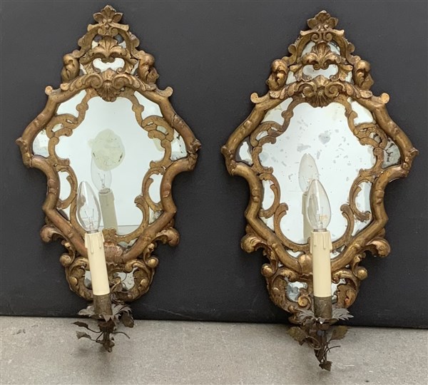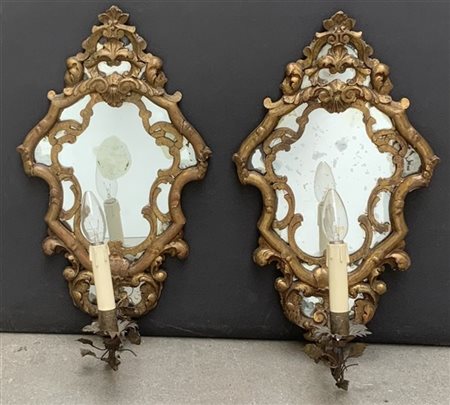Coppia di ventole in legno dorato e intagliato a volute, portacandele in metallo laccato a foglia (cm 50x28) (difetti)