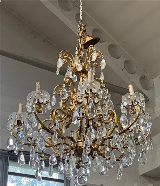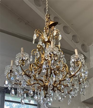 Lampadario a otto fiamme in bronzo con braccia mosse cesellato a foglie con pendagli in cristallo (h cm 72) (difetti)