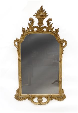 Specchiera rettangolare in legno dorato e intagliato con cimasa scolpita a vaso (cm 75x140) (difetti, restauri e mancanze)