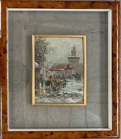 "Castello Sforzesco innevato" olio su tavola (cm 23x17) Firmato in basso a sinistra. In cornice