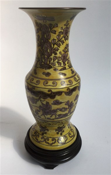 Manifattura orientale, vaso a balaustro in ceramica gialla con base in legno, sec.XX (difetti)