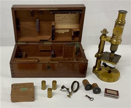 Microscopio in ottone, in scatola di legno con numerosi inserti.