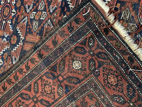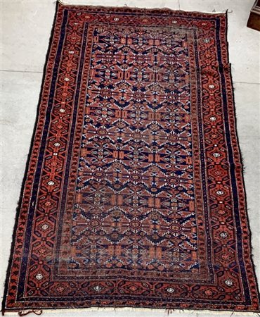 Tappeto Beluchistan, Persia, fine Secolo XIX. Decoro geometrico all over su fondo blu notte (Difetti e rapature) (cm 293x162)