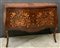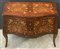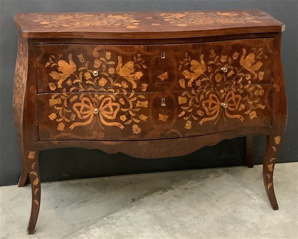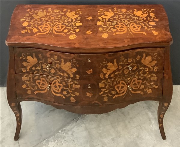 Commode di forma mossa lastronata e intarsiata a nastri e mazzi di fiori.(difet
