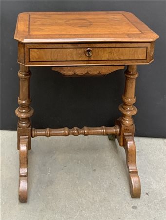Tavolino da lavoro ad un cassetto con fascia e piano filettati, montanti e traverse tornite, secolo XIX (cm 40x70x55) (difetti)
