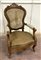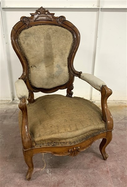 Poltrona in noce intagliata di forma mossa, seduta e schienale imbottiti (gravi difetti)