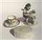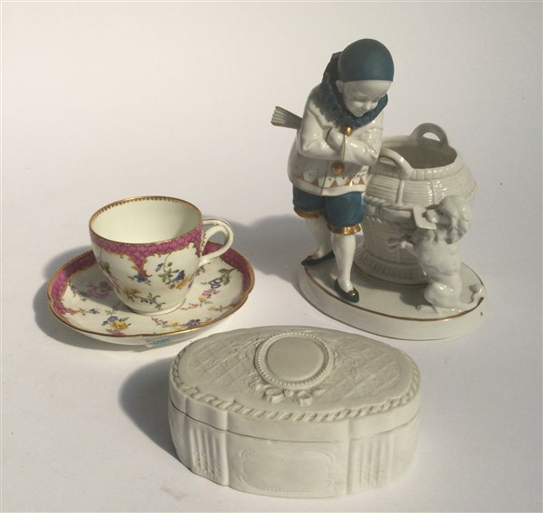 Lotto composto da una scatolina con coperchio in ceramica bianca (cm 13x8x5) ed una tazzina con piattino in ceramica di Meissen ed una scultura in ceramica raffigurante un clown con un cane (cm 15x20x10) (difetti)