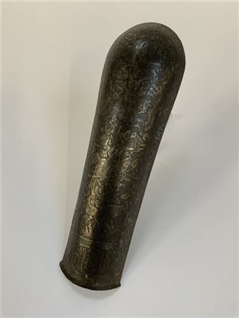 Bazu-band, protezione per l'avambraccio, in ferro con incisioni raffiguranti personaggi a cavallo e scene di caccia e terminante con riserva di versetto coranico. Persia, probabilmente Iraq, secolo XIX (h. cm 31) (lievi difetti)